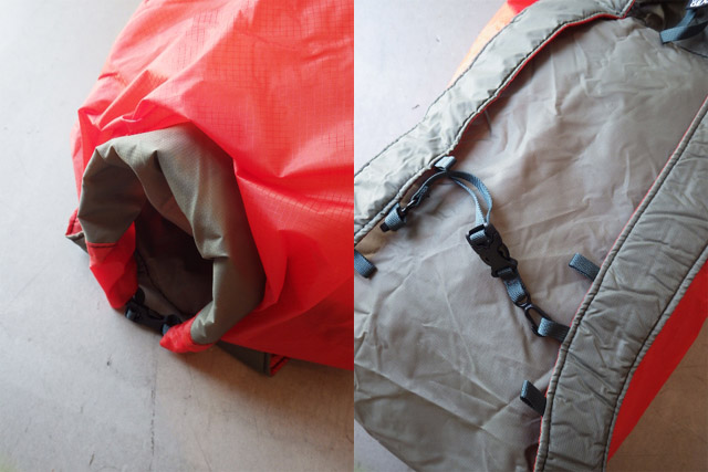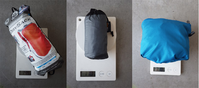 やはり最初の2点は、スタッフサックで多用されるシルナイロンをメインの生地で使っているので断然軽く、背負えるドライサックといった位置づけ。