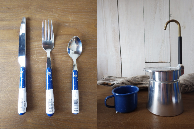 カトラリーは持ち手にホウロウがあしらわれ、どこか懐かしい雰囲気。