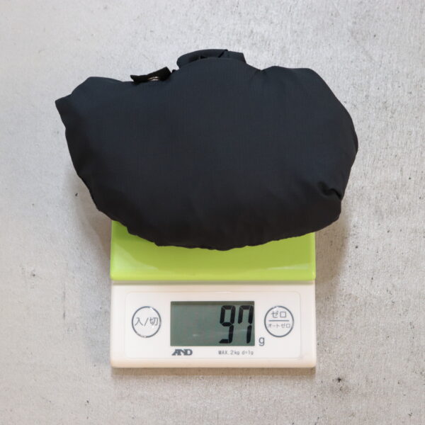 そして、こちらの製品はポケットが一つだけありますが、本体をしまえるポケッタブル仕様になっていて、袖がないのでよりコンパクトになり超軽量(写真:M’s Sサイズ/W’s Mサイズ)なので、長袖を持っていく必要がないのであればさらに軽量化を図れるので山行にもとても便利です。