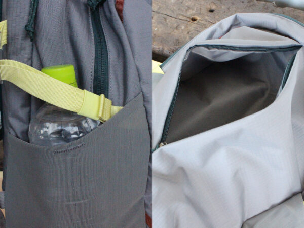外側には、左右にボトル用ポケットを配置。すぐに取り出したい水筒や折りたたみ傘などを入れておくのに便利です。さらに上部にはジッパー付きの小物ポケットがあり、スマートフォンや鍵、イヤホンなどの収納にもぴったり。