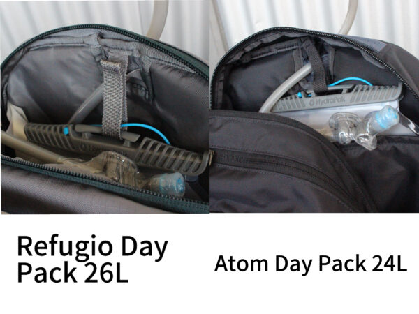 公式サイトでは明記されていませんが、Refugio Day Pack 26L と Atom Day Pack 24L のどちらも、実際の使用においてはハイドレーションパック(給水システム)を問題なく収納可能です。