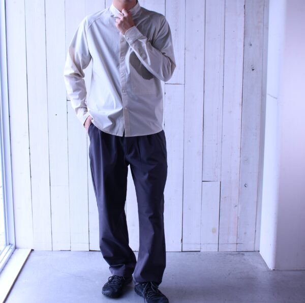 タック入りパンツの上品さが活きて大人カジュアルなスタイルな印象に仕上がります。山と道のBamboo Shirt、UL Shirtなどもおすすめです。