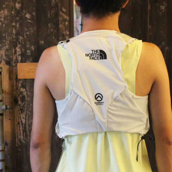 背中側は大きく切り込まれおり、脇下の開きも大きいように見えますがトレランパックとの干渉を考慮してギリギリまで削ったが故のデザインで肩甲骨を大きく出すことで肩回りの解放感も高くなります。