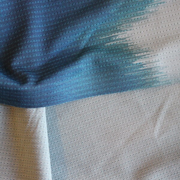 また、肌面(写真の白い生地)は、耐久はっ水糸を使用したドライタッチ編み組織となっているので、汗でビシャビシャになってもドライ感を保ってくれます。これにより、肌へのまとわりつきを軽減し不快感や動きにくさを感じにくくなっています。そしてポイントなのが、メッシュ構造の様に高い通気性を備えているのですが、表裏両面共に平で滑らかな触り心地なんです。