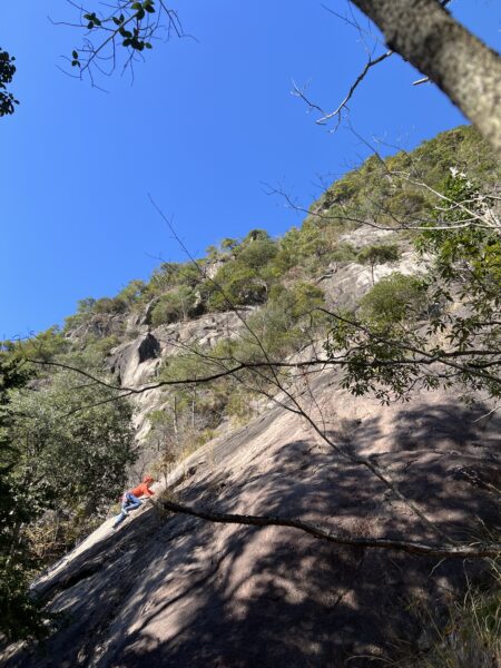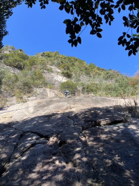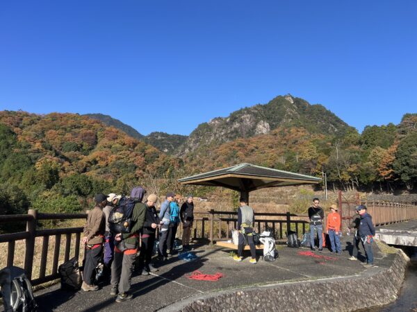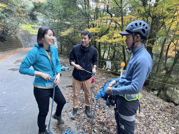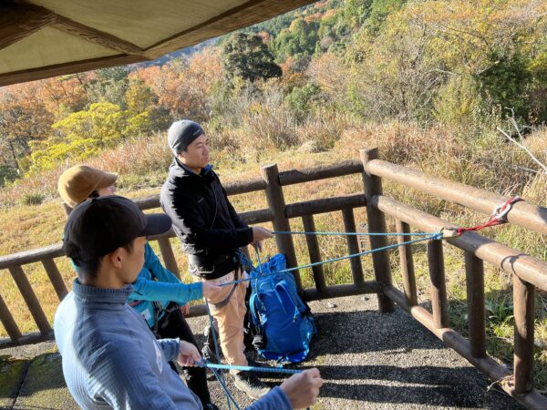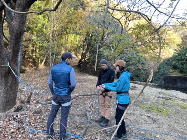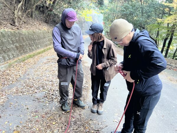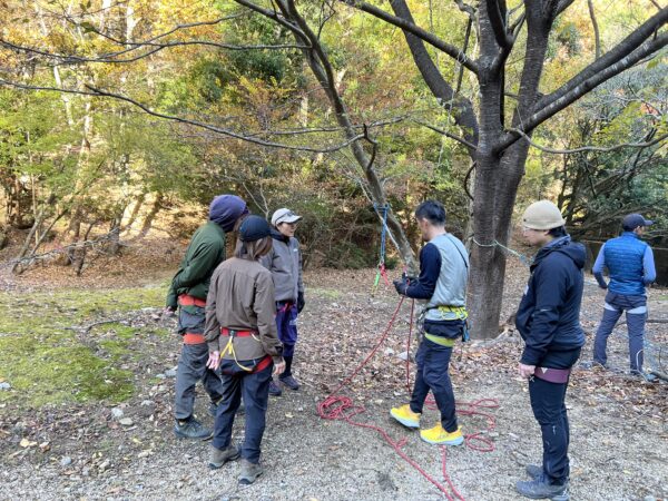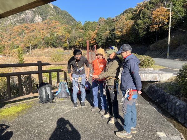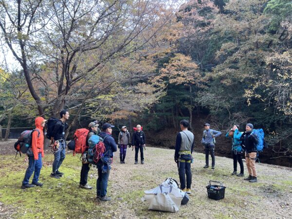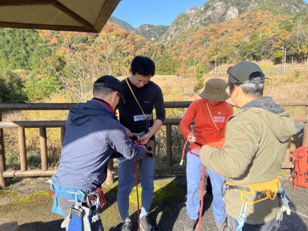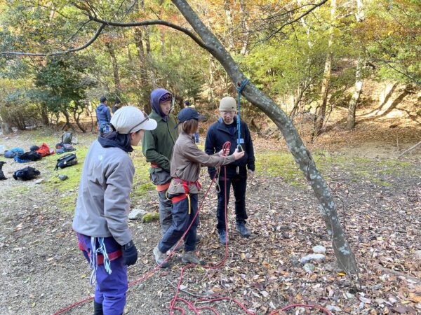 参加頂いている方の山遊びスタイルは人それぞれなので、ハイカー、クライマー、沢や等々。勿論、ロープワークへの知識もそれぞれ違うので、ガイドの新名氏からのレクチャーと共にお互いに教え合う環境の中で進んでいきます。