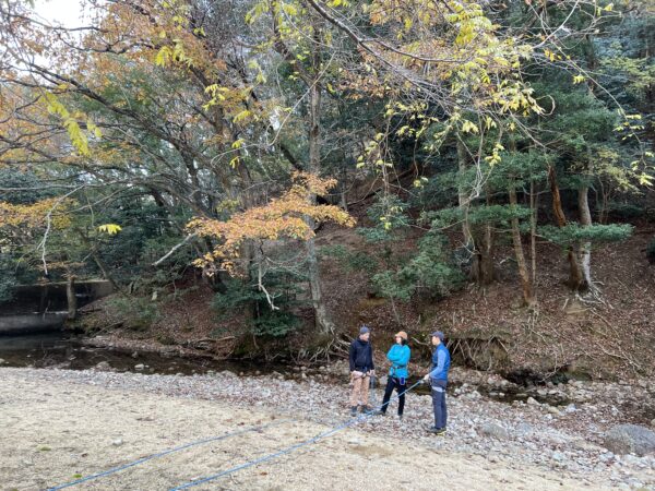 ハーネスを持っていない状況下で、ロープを体に固定して如何に安全に渡渉をするか。非常に分かりやすい説明でレクチャー頂き、私も忘れないようにイベント後に何度も結び方を練習しました。