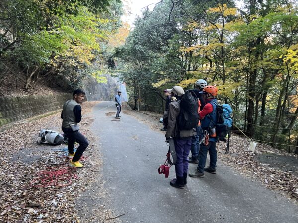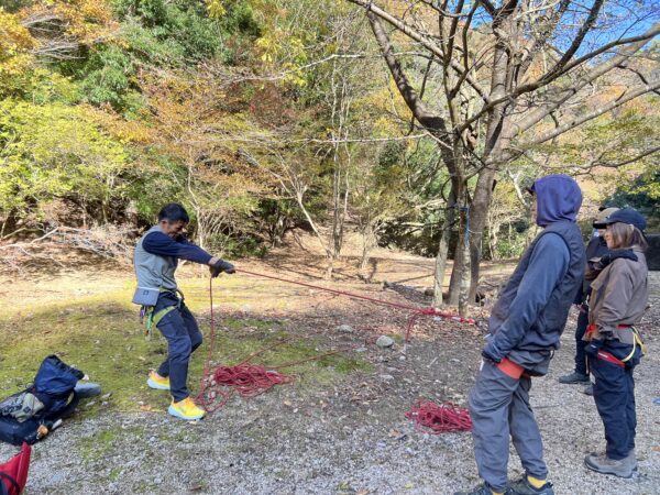 山を下りて、もう終わり…と思いきや、最後のワンレッスンがありました。伊藤新道のような渡渉の際に必要なロープテクニック講座です。