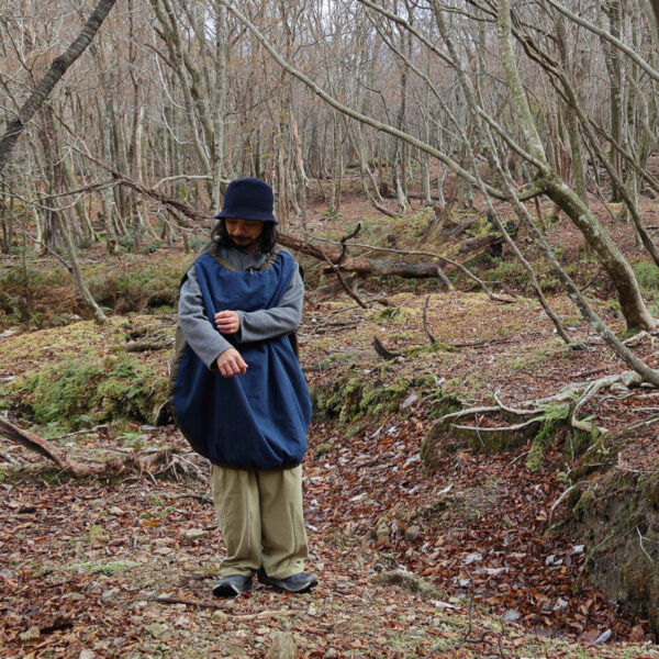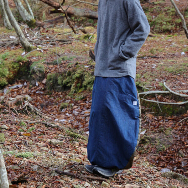 パンツの上から履く事を想定しているので、両サイドにはパンツのポケットへアクセスする為のジッパーが配されており、写真の様に着ることもできます。凄く寒い時はしゃがんでスポッと膝もスカートの中にしまってしまえば全身ヌクヌクです。