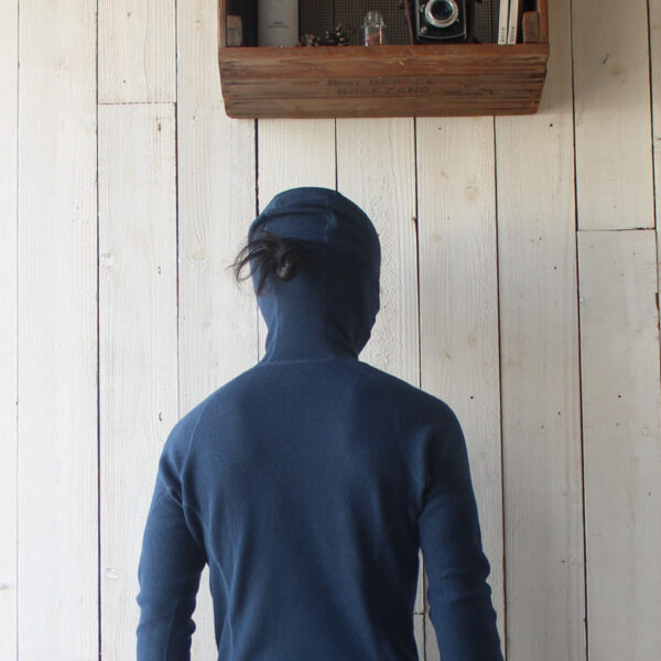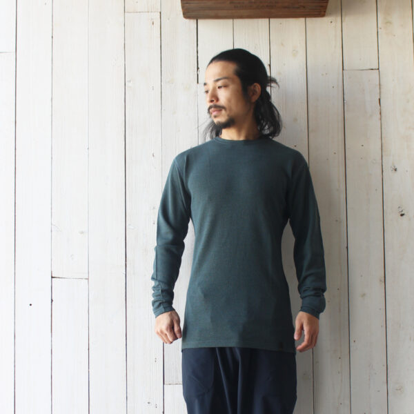 ニット状になっている生地は、フワフワとした質感がありメイン素材にはメリノウールが使用されています。そして、ニット構造であるが故に生地に嵩があり、レイヤリングにより空気を閉じ込めれば高い保温力を発揮。上から着ている衣服のベンチレーションを開ければニットの隙間を空気が一気に通り抜けて換気してくれる。温かくも体温調整がしやすい仕様になっています。
