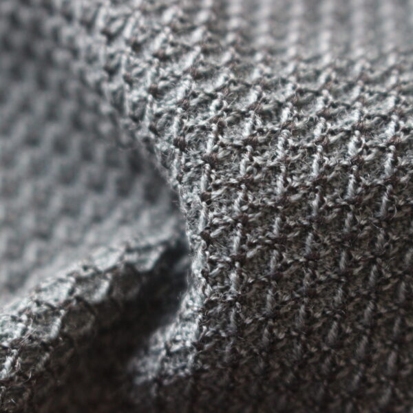 そして、最も特殊なのが裏地部分。肌面にはメリノウール糸だけでなく疎水性素材であるポリプロピレン(以後PPと表記)糸も使用しています。PPは疎水性という特性を持っており、水分を保持しません。しかし、全く水を吸わないわけではなく、繊維状にする事で毛細管現象により汗を吸い上げてくれるのです。肌面へ凸型にPP糸を出す事で、肌表面の汗がPPに吸い上げられ表側のメリノウールへと移行します。しかし、PP自体は保水性が無いので肌面をドライな状態に保ってくれるのです。要するに、メッシュ状のドライレイヤーを着た上からメリノウールのベースレイヤーを着た状態を一枚で作り出しているということ。