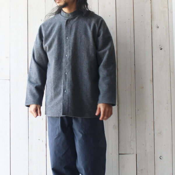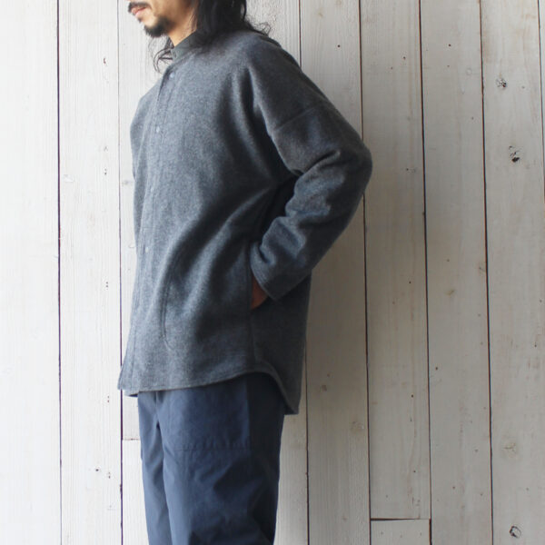 ウール生地の3大名産地の一つである尾州(愛知県一宮市、岐阜県羽島市周辺)。その尾州で織られたウール生地を使った服。見た目的にシャツ?羽織?ウールフリース?と明確なポジションがいまいち分かりづらいのですが、メーカーサイトでは「シャツ」表記となっており、私もそんな感じで使っています。