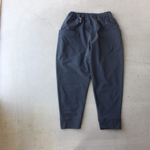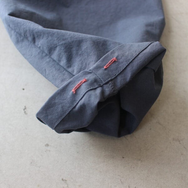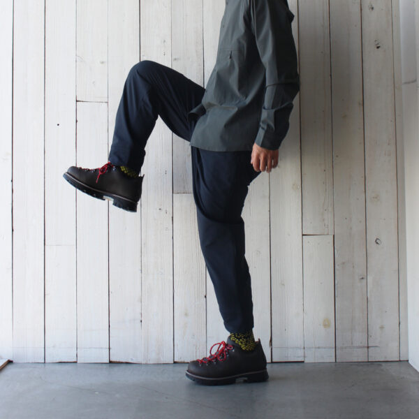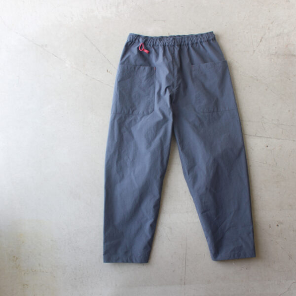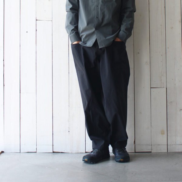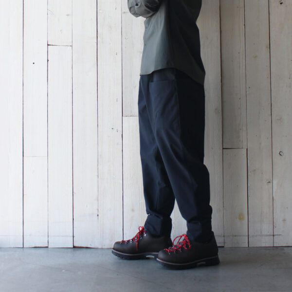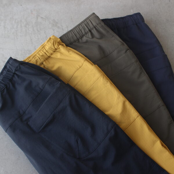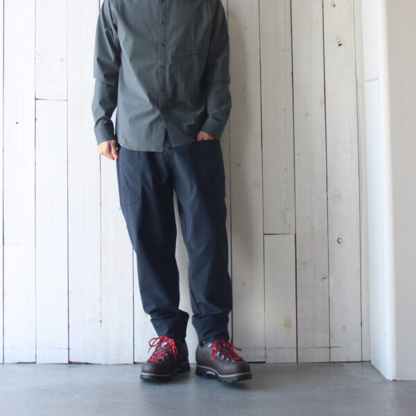 山仕事の作業着として使われていた野良着から着想を得た山パンツ。ヒップから太もも回りはゆるく太めで、膝から裾に向かって少しずつテーパードがかかっている独特な形。ウェスト調整はベルトは無く、ドローコード式でスッキリとした見た目になっています。
