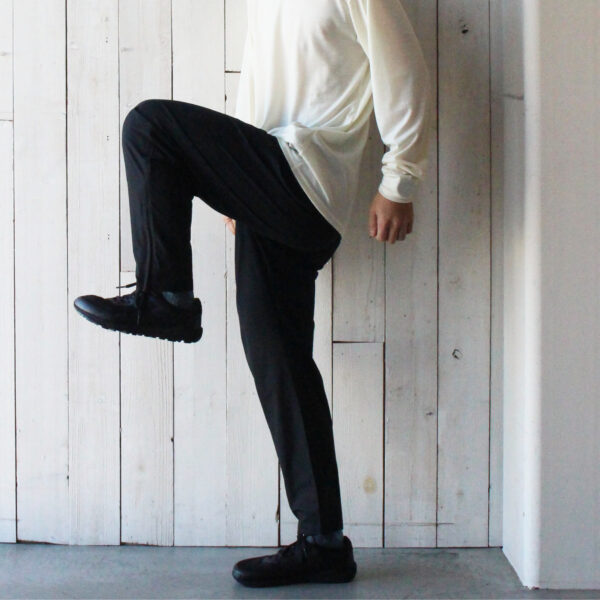 それでいてストレッチもちゃんと効いている。ノビノビストレッチ系のパンツにはスパンデックス(ポリウレタン)が使用されている事が多いのですが、敢えてヒアネスはスパンデックス(ポリウレタン)を使わない、もしくは限りなく使用量を減らすという取り組みをしています。