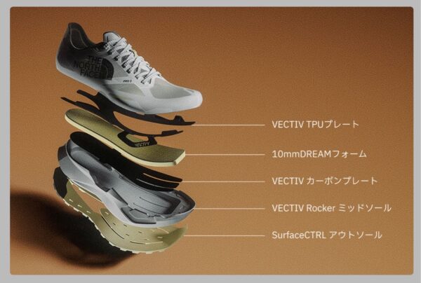 VECTIVシリーズの要である3Dプレート。平面状では無く、3D構造にする事でよりシューズ全体の安定感を高める作りになっています。そして、VECTIV Forwardのプレートにはカーボン+Pebax配合の素材が使用されており、多くの方が「カーボンプレート」と聞くと凄く速い人が履くシューズに入ってるヤツだ!と思われるかもしれません。