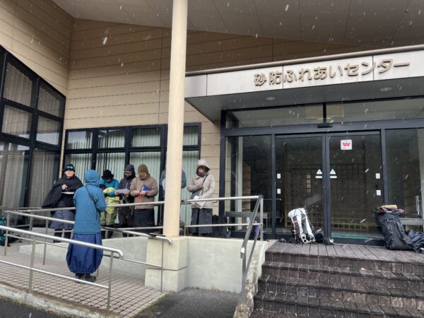 集合場所は東海地区の砂防の聖地、羽谷だんだん公園。しんしんと雪が降る中、いつもの様に柳谷氏からの凌とシノギングについてのお話し、モリカツ氏による読図講習を行いました。