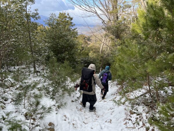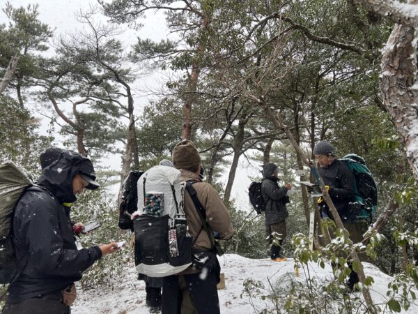 あれよあれよと雪化粧が施された山へと変わっていきました。スタート時、見えていた地面は完全に雪で隠れてしまい、いつしかの鈴鹿山脈での雪中シノギングを彷彿とさせる雰囲気に。