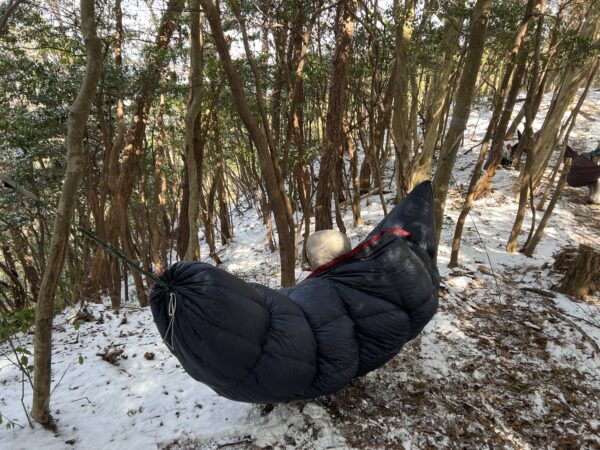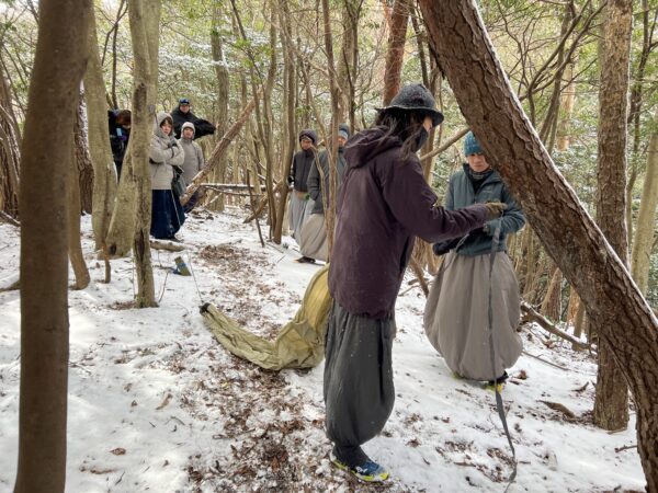 雪にも風にも負けていられません。柳谷氏からハンモックの張り方をレクチャー頂き、各々のハンモック設営へとあたります。