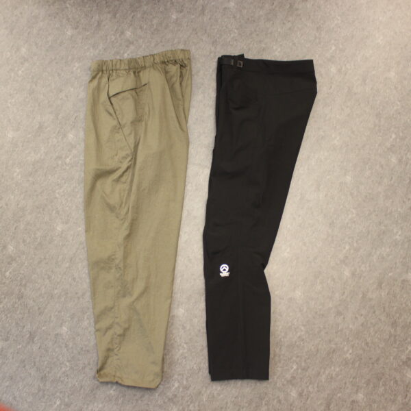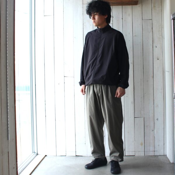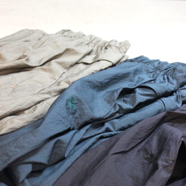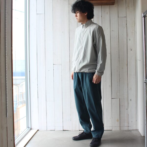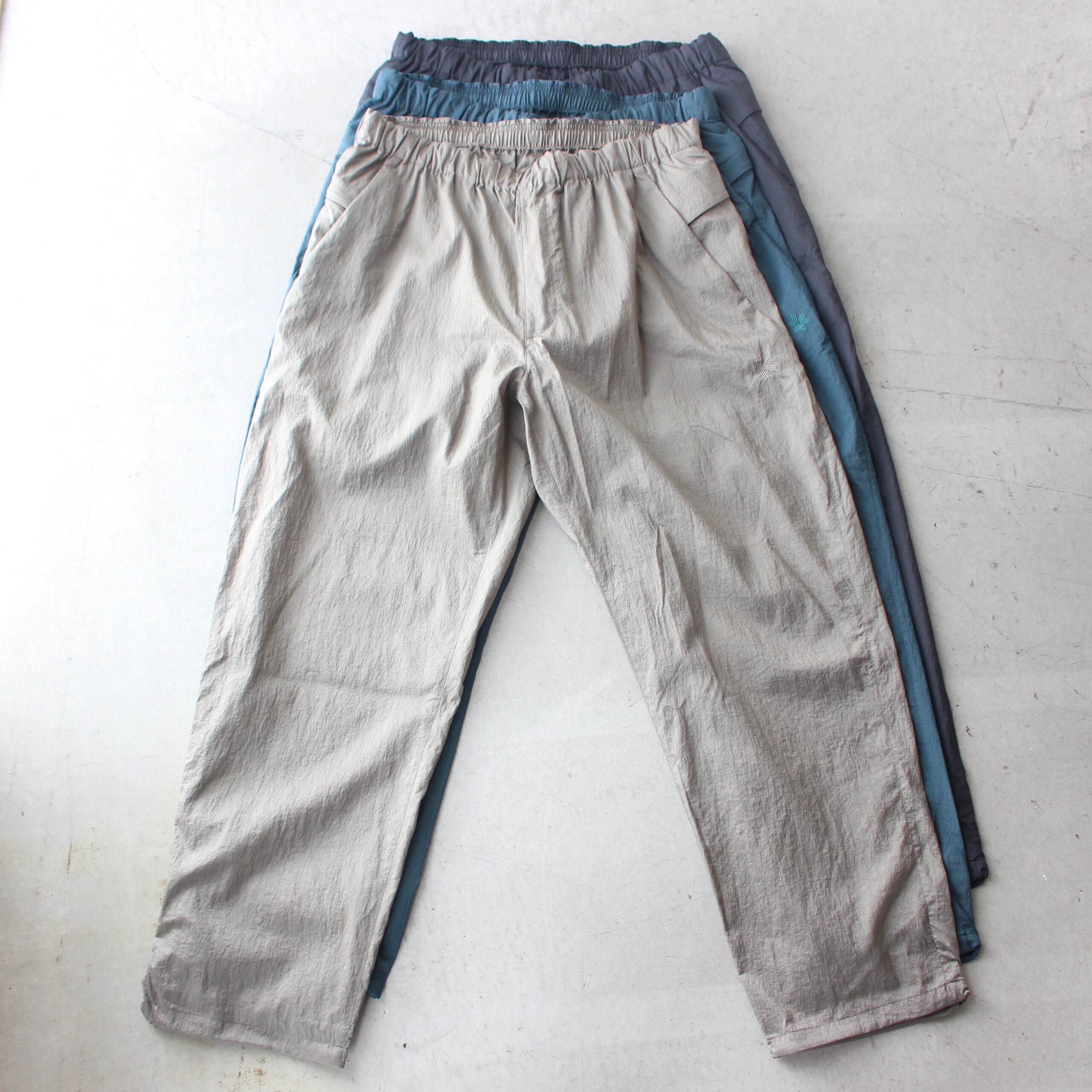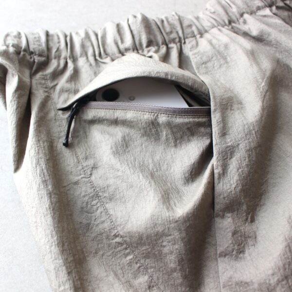 一般的なアウトドアパンツは、生地自体のストレッチ性は勿論のこと、膝まわりに立体裁断を取り入れ、膨らみを持たせることで可動域を確保しています。ですがこのパンツは少し違い、立体裁断ではなく、独特なカッティングと程よくゆとりのあるシルエットによって可動域を確保。これにより、見た目がテクニカルになり過ぎず、「如何にも山パンツ感」を一切醸し出さず、美しさと動きやすさを両立しています。さらに、生地は非常に薄手でしなやかなナイロン素材を採用。足を上げたときにも生地が突っ張りにくく、動きが自然で、ストレスのない快適な穿き心地を実現しています。