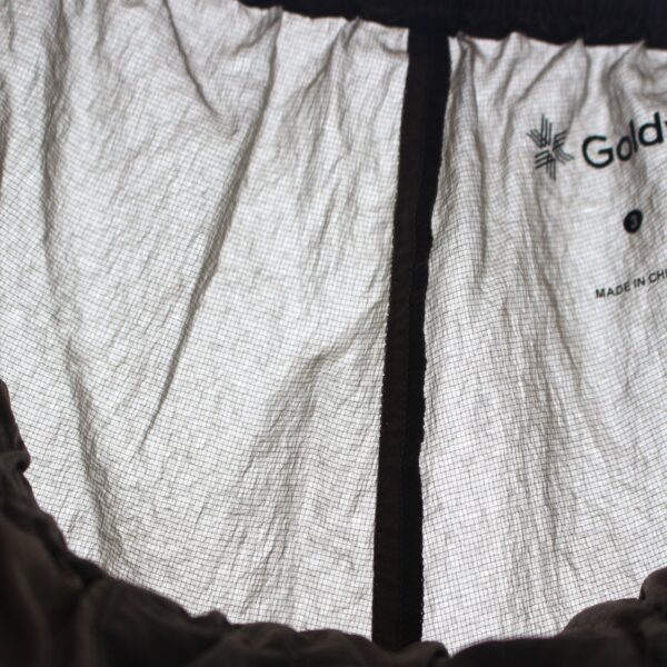 さらに上の写真の表面の生地を良く見てみると光沢感のあるキラキラした見た目が際立ちます。山用パンツでは中々見ないタイプで、外遊びウェアでありながらも高級感も感じる不思議な魅力があるんです。
