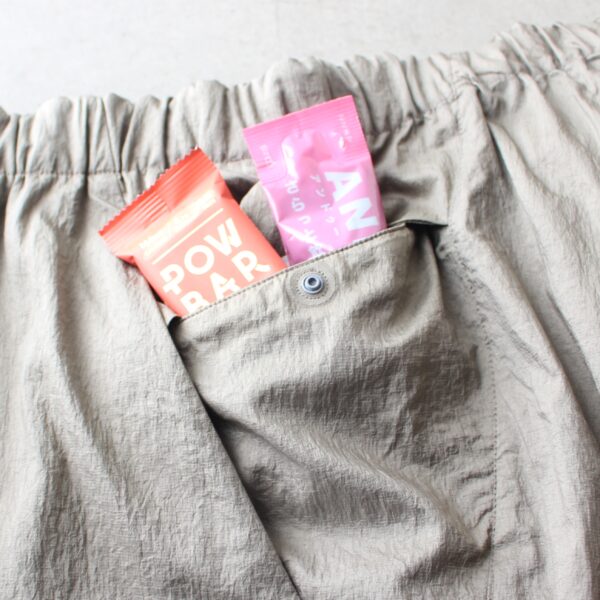 両サイドスリットポケット付き。さらに脇ポケットを配置し、右側はファスナー付きでセキュリティ面を高め、スマートフォンや財布などの収納にも便利です。左側はスナップボタンで簡単に小物の出し入れがしやすい設計。登山、ハイキングでも軽食などを気軽にしまえるので、直ぐに栄養を補給することが出来ます。さらに脇ポケットは足上げをした際に物が妨げにならず、揺れにくい仕様。