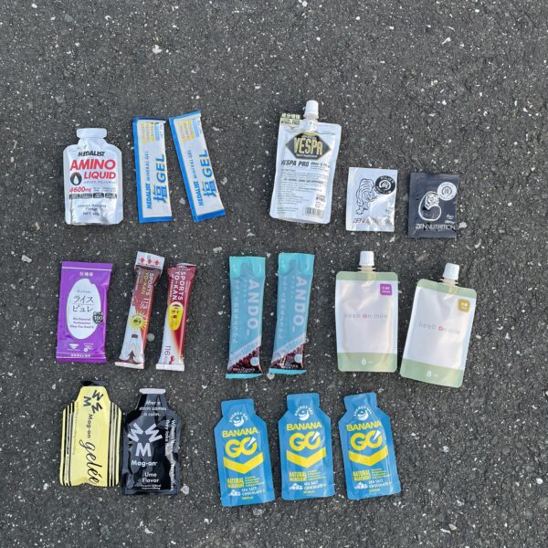 ジェルが得意ではないので前半はスポーツようかんやライスピュレなどの固形物系を多くとり、後半はジェル多めの構成。45分間隔でとり、丁度でした。