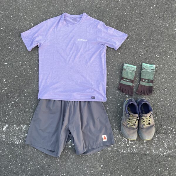 シューズは大人気LONE PEAK 9+を履きました。ソックスのInjinjiとの相性が良く、しっかり自分の足を使って走ることができます!