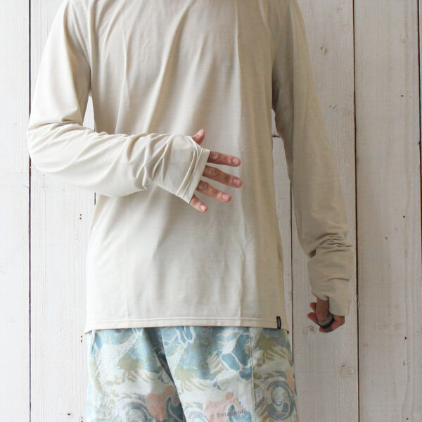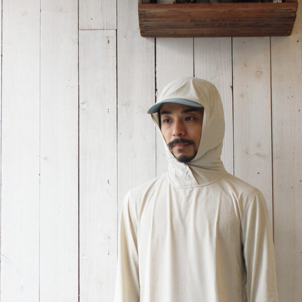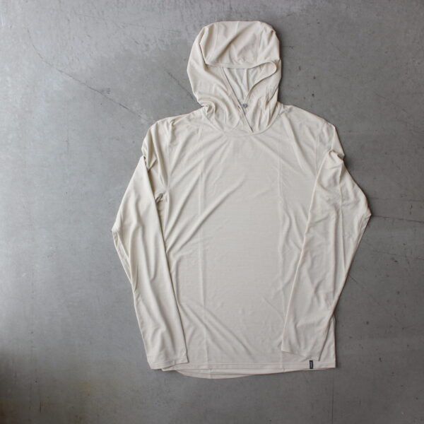 個人的には、このフーディータイプが結構使い勝手良いのでは無いかと思っています。サラサラで気持ち良く着れる長袖フーディーは夏なら標高の高い場所で、端境期であれば低山域で。また冬にはランニングのベースレイヤーとして、年間を通してアクティビティーで活躍してくれます。