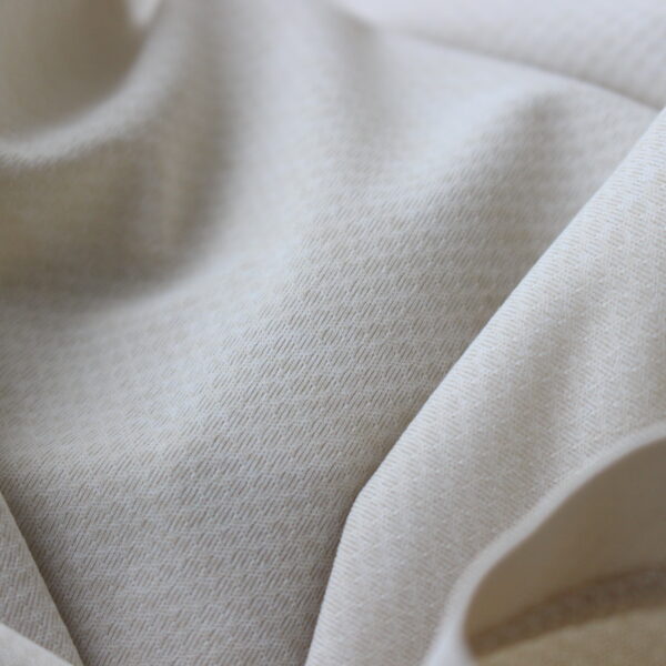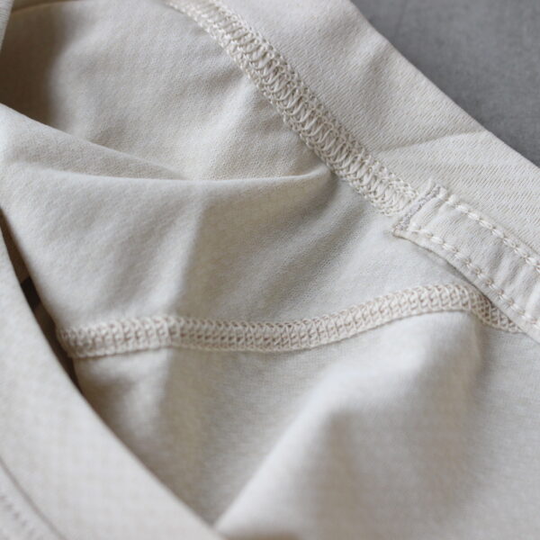 極薄生地は表地と裏地で微妙に形状が異なるハニカム構造となっており、非常に微細な凹凸がある為、生地と肌との間の通気性を確保し、優れた速乾性を発揮してくれます。