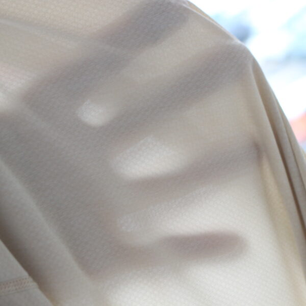 生地の裏側に手を入れてみるとこの様に透けて見える程の薄さ。昨年からテストさせて頂いていたのですが、暑い時期の着用感は非常に良く、キャプリーンクールデイリーのスリーブレス(コチラ■)よりも交通きで涼しく着る事が出来ました。ただ、生地が軽く薄いが故に擦れに対しての耐久性はクールデイリーの生地の方が高く感じた為、ジムワーク等で腹筋運動をしたりすると体重が乗って擦れる背中回りは早く毛羽だってしまうかもしれない為、そういったシーンではクールデイリーを使い、ランニングやトレラン、登山等ではクールウルトラを使うといった具合に用途に合わせて分けてあげる事をおススメします。