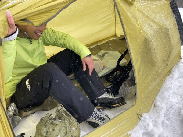 初日は天気も今一つだったため車移動とロープウェイで上がり、ゆっくり歩いて西穂山荘のテン場まで。