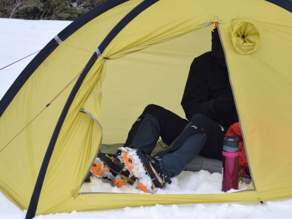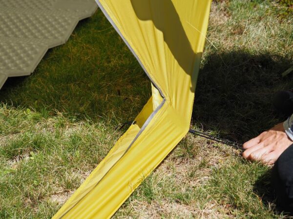 靴のままシェルターに入れ、時には玄関を広く、時には寝床を広くなど、その時の状況に合わせて好みにカスタマイズできる便利さがあります。