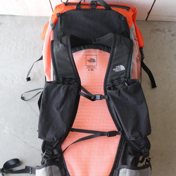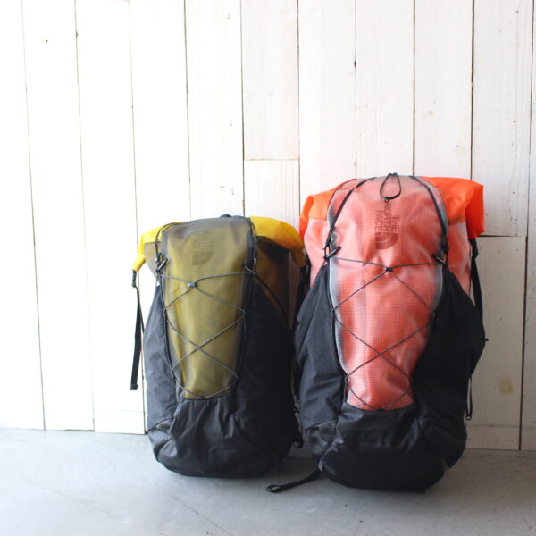 水に濡れないように外側で防水するのではなく、敢えて水を通して保水させず、中身で防水する新しい発想から生まれたSUM。その名の通りノースフェイスの培ってきた技術の合計とも言えるパックです。重量はSMサイズの35ℓで約875g(本体 約725g、パックライナー 約150g)、45ℓで約940g(本体 約770g、パックライナー 約170g)と、めちゃくちゃ軽いわけでは無いのですが、モノメッシュの見た目からか手に取ると数値ほどの重さを感じないのが不思議なところ。