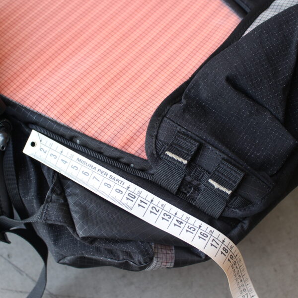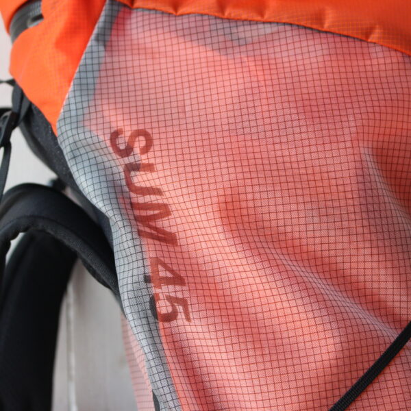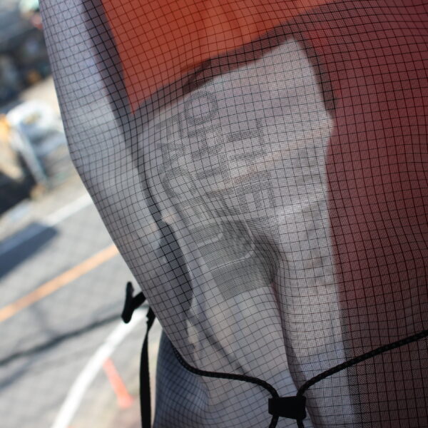 まずメインボディーに使用されているこの半透明上の生地は、モノフィラメントをメッシュ状にしたもの。ファクターのブログでも綴らせて頂きましたが、モノフィラメントはその構造状、繊維自体が保水しない為、雨に打たれたりしてもパック自体が水分を含んで重くなってしまう事がありません。もともとこの生地は、トレランパックであるHUMEシリーズの為に開発されたもの。暑い時期のトレランでは大量に汗をかくのでパック自体が汗を吸って重くなってしまうのを防ぐ目的で作られました。そして、このモノフィラメントメッシュの生地は張りコシがしっかりしているのも特徴で、パッキングもしやすくパックの形が崩れにくいんです。もちろんSUMもモノメッシュが背面側にも使われているので、背中でかいた汗をパックの生地が保水してしまう事はありません。