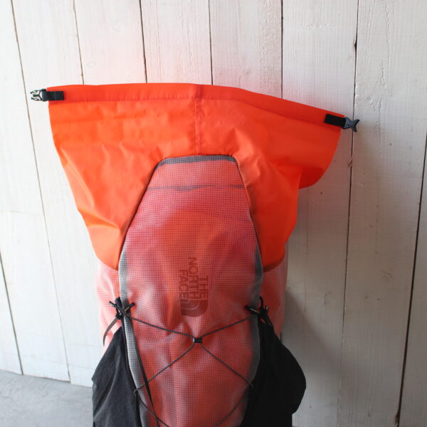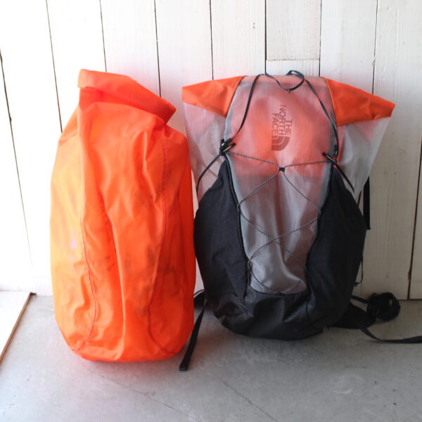 そして、本ブログのタイトルでもある「二重気室構造」の要となるのが標準装備で付属する防水パックライナー。モノメッシュの生地は保水せずに水をツーツーに通すので濡らしたくない物を防水ライナーに入れておく必要があります。