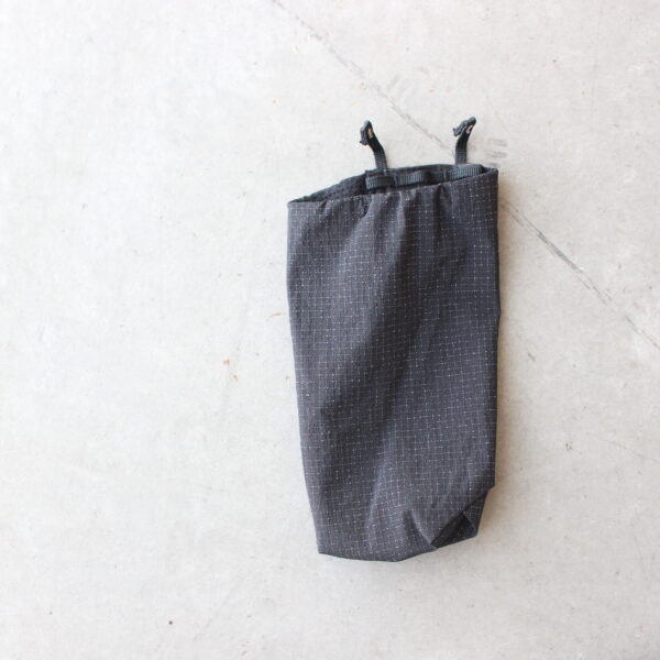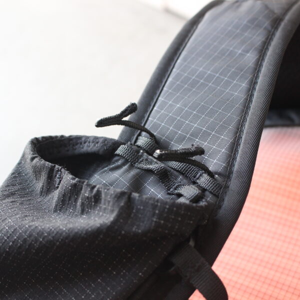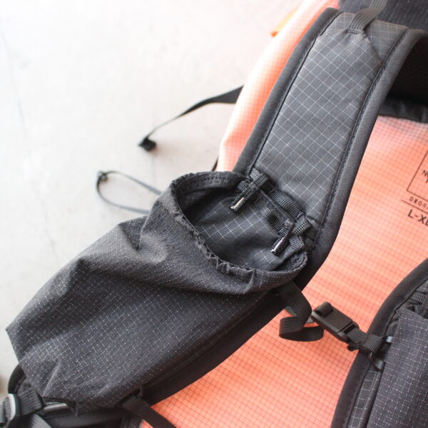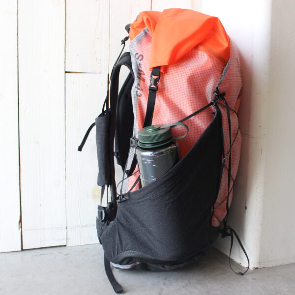そして、サイドポケットやショルダーに配されたボトルポケットにもファクターの技術が応用されており、スペクトラをリップストップで入れたストレッチナイロンの生地を採用。スペクトラを入れることで生地強度が増すと共に、大量に物を詰め込んだ際に生地が伸びすぎるのを防ぐ役割も果たしています。特にサイドポケットは写真の様に1.5ℓのナルゲンボトルがスッポリと入る深さがあるので、濡れたテントのフライシート等をガボっと突っ込んでおくことも出来ます。