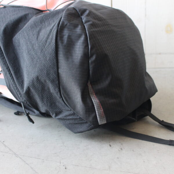 底面には左右の一部にモノメッシュを採用する事でサイドポケットやパック内に水が溜まらないようになっています。故に土砂降りの雨に降られたり、沢登の様なドボンするシチュエーションでもパック内に水が溜まったりして重さが増す事もありません。