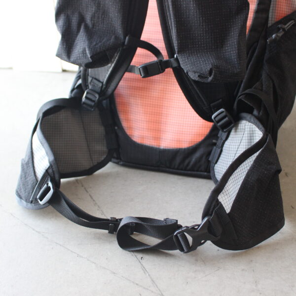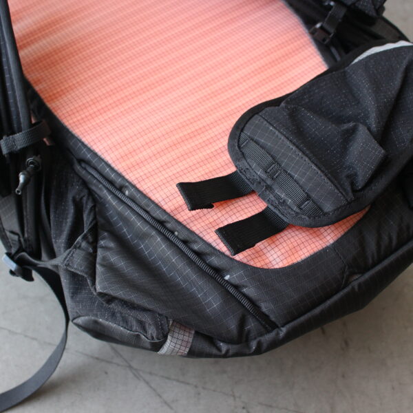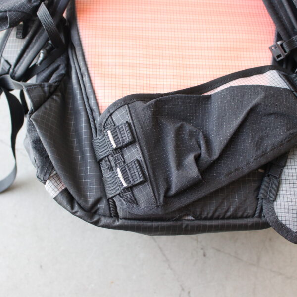 同様のシステムは腰ベルトにも採用されており、写真の様に腰ベルトは内側がモノメッシュで外側にスペクトラリップ生地のポケットが付いています。基本的にSUMは肩荷重メインで背負う作りなので、腰ベルトは添える程度のイメージとなっており、しっかり荷重させるというよりパックの安定感を確保する為の物。