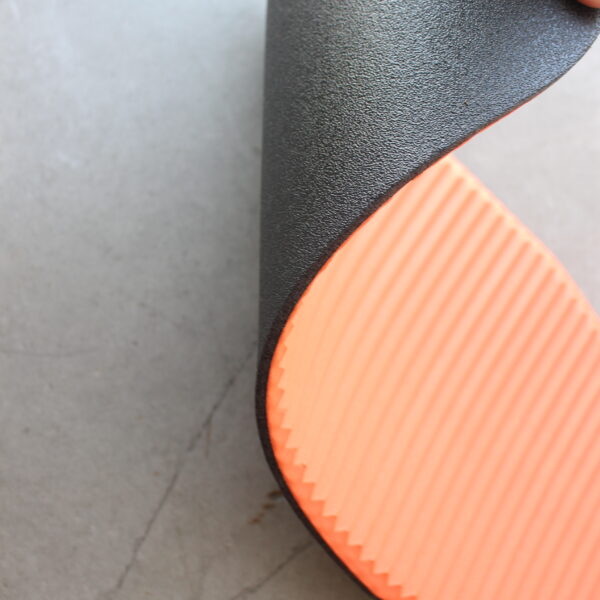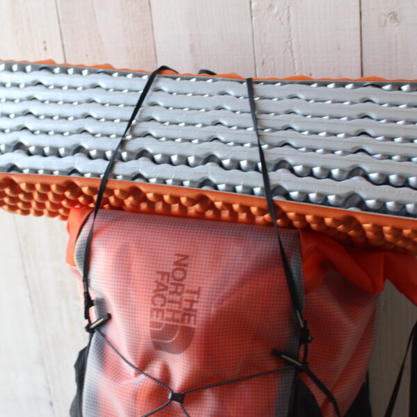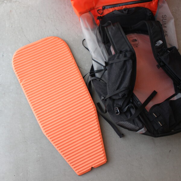 ファクター同様に二重構造で背中側(オレンジ側)は波状にすることで通気性を確保し、荷物側(グレー側)は硬くなっているので荷物の凹凸感を背面に伝えにくくなっています。