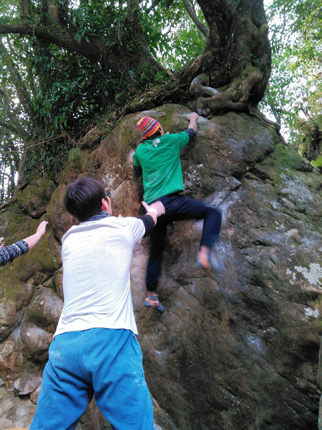 (日之影ボルダー/シークレットボーイ/初段を登る友人、無事完登)