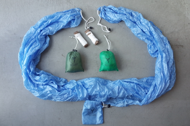 ハンモック本体と、木や柱に固定する用途のストラップ。