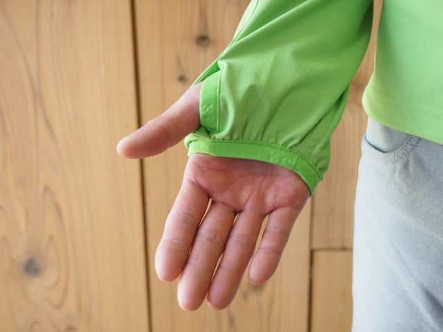 袖口にはサムホールも付き、少々冷え込んだ時や、指先が冷えてきた時などに甲を温められるので非常に便利です。