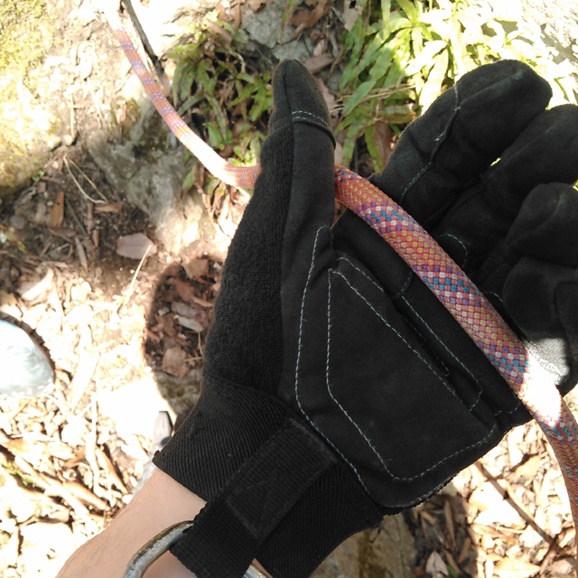 芹谷はアプローチが急登で補助ロープなどを手繰りながら登るので、ビレイグローブが役に立ちます。