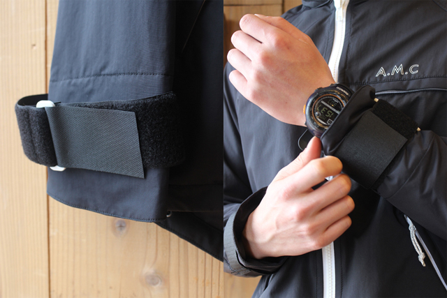 大胆なカフのベルクロバンドはグローブをしたままでも締めやすく、カフの長いグローブとの相性も良好。