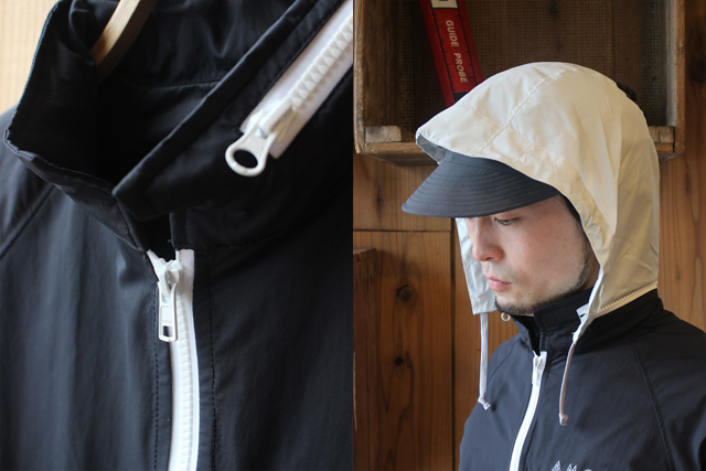 クラシックなブルゾンを髣髴とさせる立ち襟には薄手の生地でフードが格納されており、ちょっとした雨の際などに活躍してくれます。