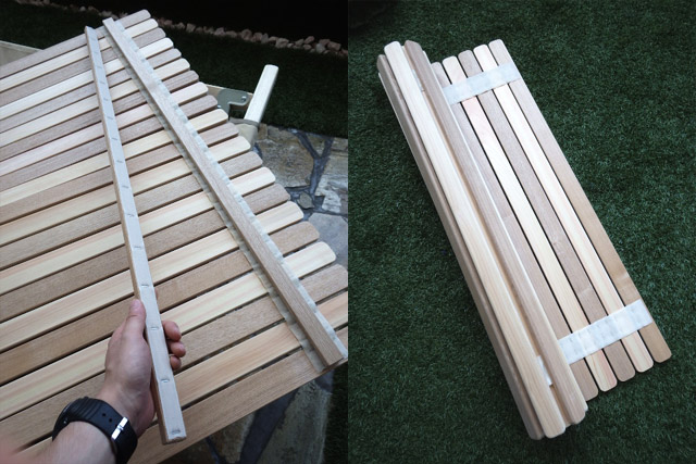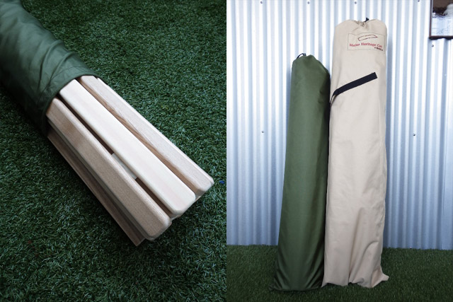 裏側にベルクロで留めてある支えの棒を2箇所外すと天板がロール出来るので、丸めて細長い付属のスタッフサックに入れて持ち運べます。
