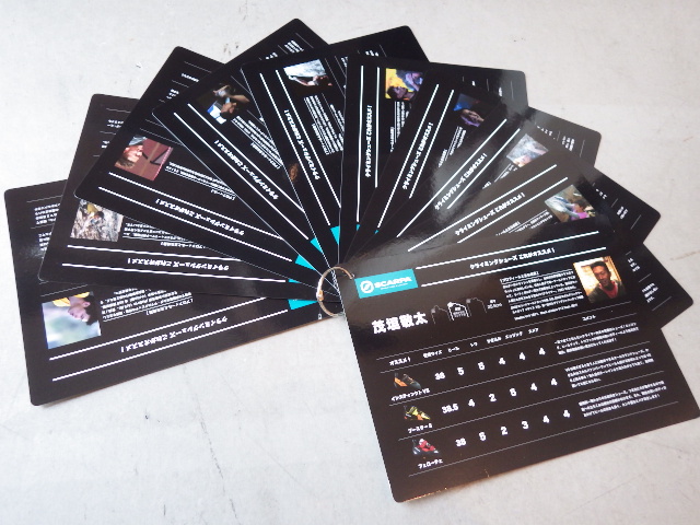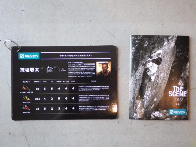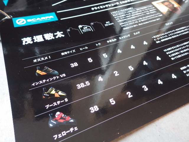 左側のカードは茂垣敬太さん、渡邉数馬さんをはじめとする錚々たるスポンサードクライマー10名の足型、実寸、実際に履いているおススメのクライミングシューズや着用サイズ、インプレッションなどをシートにまとめたもの。