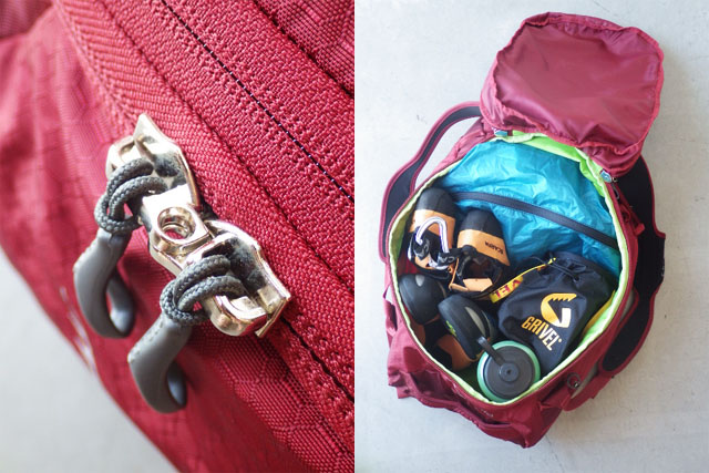 セキュリティーキー対応のジッパーを開けると、着替え、シューズ2~3足、飲料ボトル、チョークバケット等を入れてちょうどよいサイズ感。