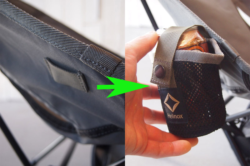 座って左手側はTACチェアのようにポケットがあり、右手側にはなんと取り外し可能なカップホルダーが付いてきます。