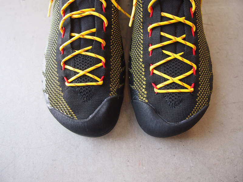 シューレースのシステムはクライミングシューズの“ミスト”と同様にし、レース末端から引くだけで全体的にフィットします。