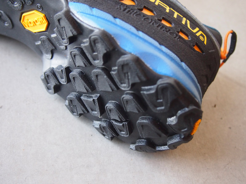アウトソールはHOKAなどでもおなじみVibram Mega-Gripを採用し、高いフリクション性能で岩の上を歩く際も安心です。